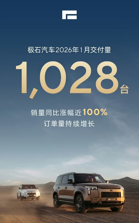 极石汽车2026年1月交付1028辆,销量同比涨幅近100%,订单量持续增长。2025年,极石汽车全年交付15318辆,同比增长近3倍。截至目前,极石汽车已进军中东、中亚、非洲等全球40多个国家和地区,并在多个区域建立本地化服务网络。