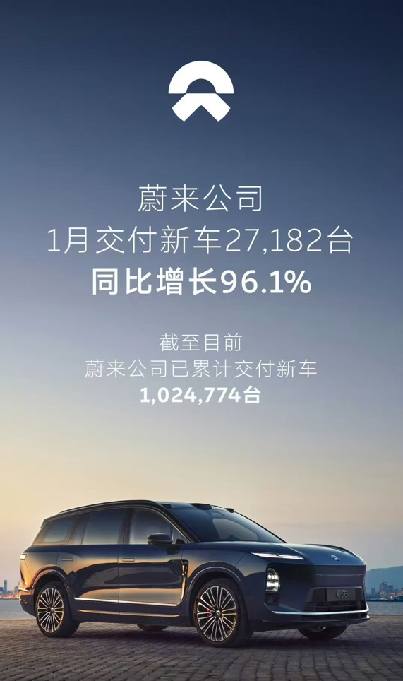 2026年1月,蔚来公司交付新车27182辆,同比增长96.1%。截至目前,蔚来公司已累计交付新车1024774辆。1月6日,蔚来第100万辆量产车正式下线,在理想、零跑、小鹏之后,成为第四家交付百万辆的中国“新势力”车企,也是全球第二家实现百万交付的纯电车企。